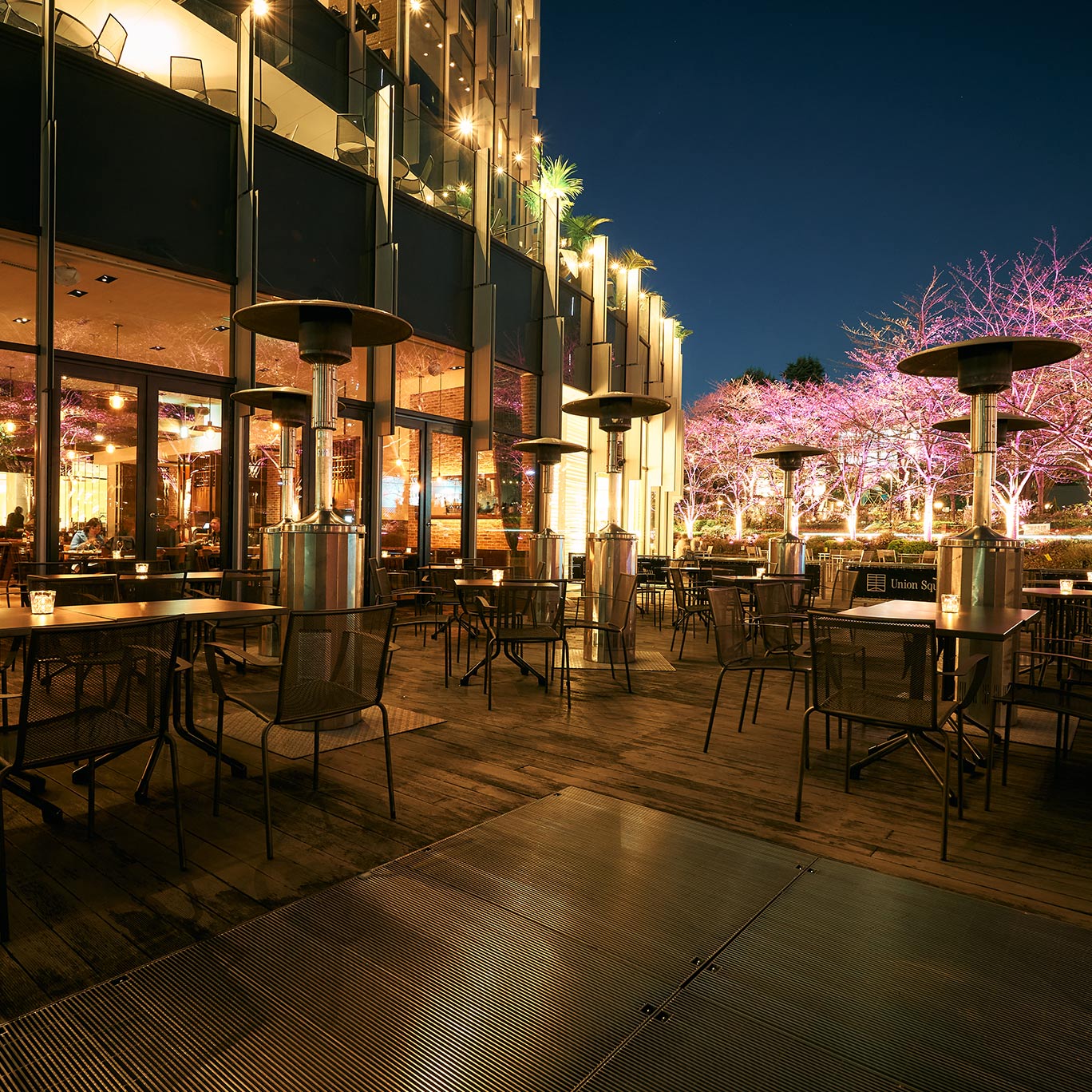 The terrace seating faces the Midtown Garden and a grassy plaza, providing an excellent spot to enjoy cherry blossoms in spring, lush greenery in summer, and festive lights during the Christmas season. Guests can immerse themselves in nature during the day and enjoy the pleasant evening breeze at night.